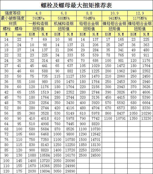 力矩?fù)Q算其實(shí)就是螺栓螺母扭矩值推薦表,通過這張表我們能夠查詢出螺栓螺母強(qiáng)度等級、材質(zhì)和螺栓大小扭矩值,通過這些數(shù)據(jù)我們也能更好的選型,知道自己的工況適合哪一種液壓扳手。其實(shí)如果你看不懂這張表,不知道中空式扳手力矩值換算怎么弄,也沒關(guān)系,畢竟現(xiàn)在很多液壓扳手品牌商家都會為你進(jìn)行售前選型。