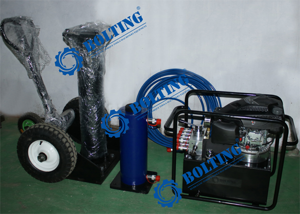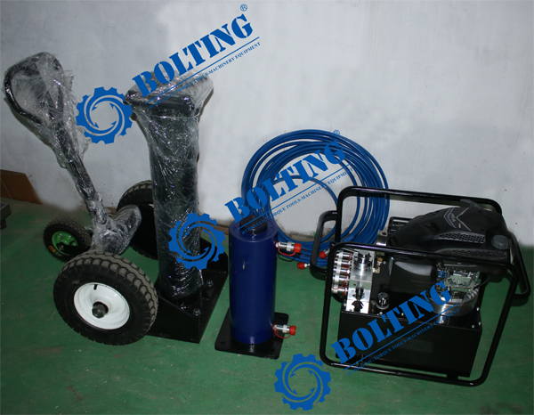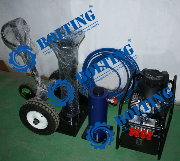 近日為河南某重工企業(yè)定制的移動(dòng)式液壓駕車機(jī)準(zhǔn)備發(fā)貨,因客戶現(xiàn)場工況受限,采用汽油發(fā)動(dòng)機(jī)動(dòng)力液壓泵作為動(dòng)力源,配備移動(dòng)駕車機(jī),50T通用型雙作用液壓千斤頂和10m的雙聯(lián)液壓油管,簡便快捷的解決了重物頂升問題。