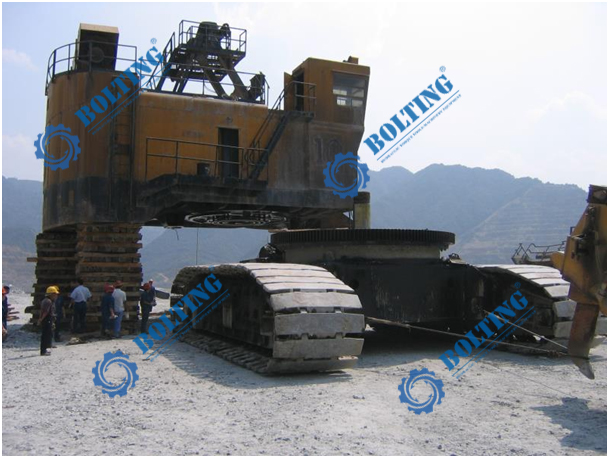 電鏟是千萬噸級露天礦山主要采掘設(shè)備之一,生產(chǎn)率高,作業(yè)率高,操作成本低,是目前采礦業(yè)公認的機型。電鏟由行走裝置、回轉(zhuǎn)裝置、工作裝置、潤滑系統(tǒng)、供氣系統(tǒng)組成。鏟斗是電鏟的主要部件,它直接承受被挖掘礦石的作用力,因而磨損較大,斗桿也是電鏟挖掘過程中的主要部件之一,它的作用是連接和支持鏟斗,并將推壓作用傳送給鏟斗,鏟斗在推壓和提升力的共同作用下完成挖掘土壤的動作;其行走機構(gòu)中最為核心的履帶裝置,經(jīng)過相關(guān)的傳動機構(gòu)最終使其在地面直接移動!