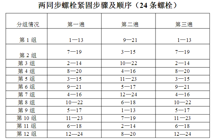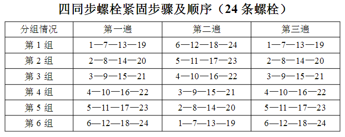 7、從1#螺栓按順時(shí)針方向,采用兩同步和四同步采用對邊緊固的原則,說明螺栓的緊固順序。單緊按兩同步的順序進(jìn)行。
